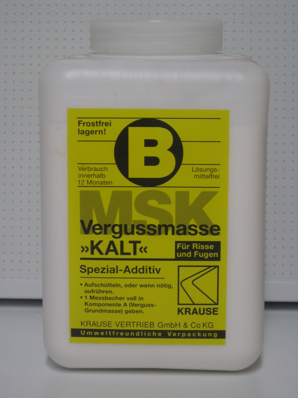 MSK-Vergussmasse »KALT« ist eine Spezial-Vergussmasse auf Bitumenbasis, bestehend aus Verguss-Grundmasse (Komp. A) und Spezial-Additiv (Komp. B).